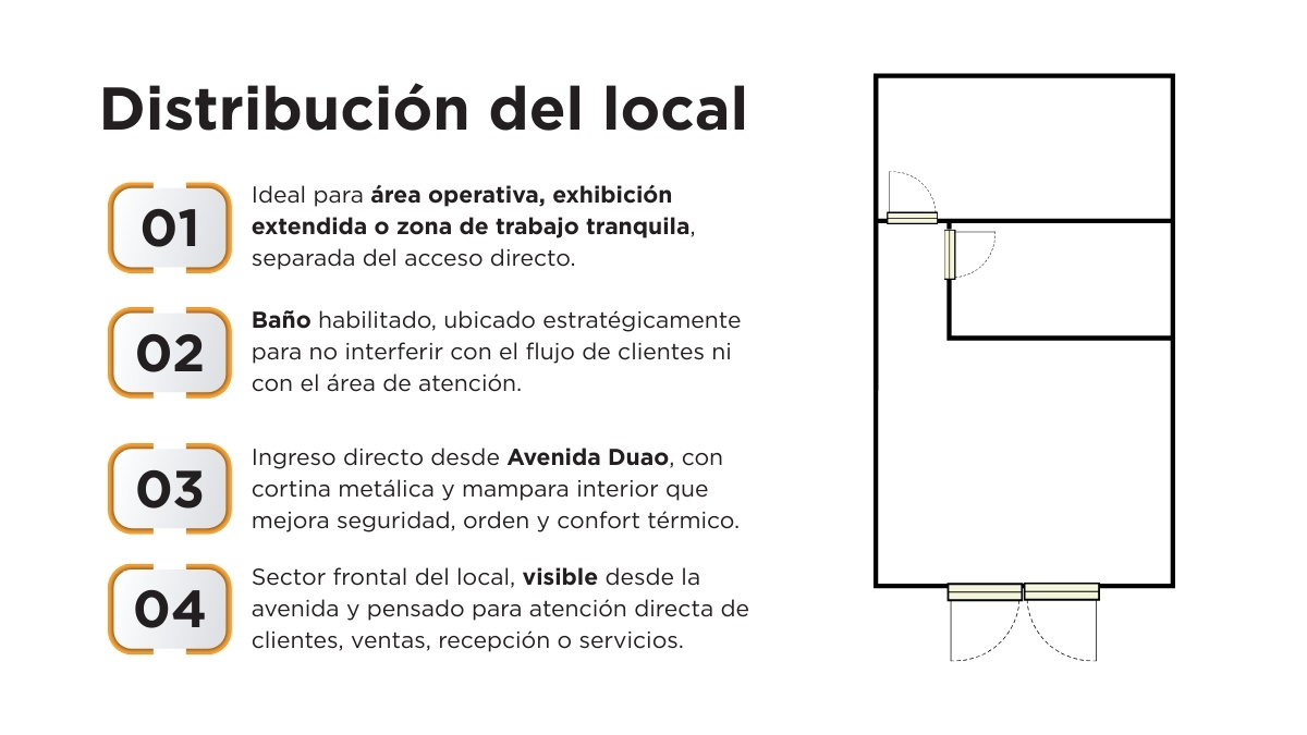 Local comercial de distribución simple y eficiente, diseñado para funcionar desde el primer día. Cuenta con un sector frontal de atención al público con visibilidad directa desde Avenida Duao, un acceso claro y ordenado, baño habilitado y un amplio espacio posterior que puede destinarse a área operativa, exhibición extendida, bodega o zona de trabajo tranquila. La separación natural entre acceso, atención y fondo permite un flujo cómodo de clientes y una operación ordenada, adaptable a distintos rubros comerciales, servicios u oficinas. Su configuración favorece tanto la atención directa como el trabajo interno, manteniendo independencia entre cada zona del local.